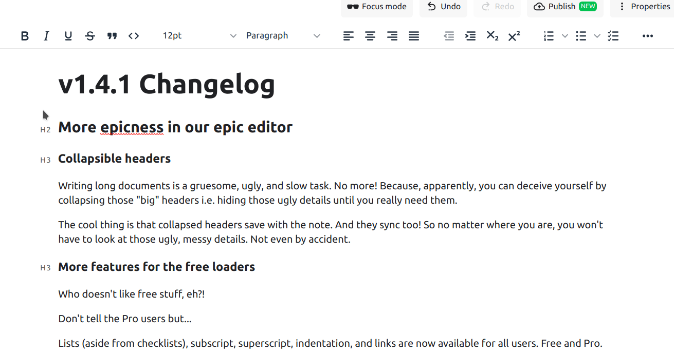 Lists (aside from checklists), subscript, superscript, indentation, and links are now available for all users. Free and Pro.