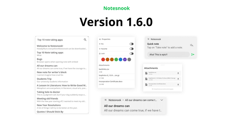Encrypted attachments are fun. You can add any file from your device and be sure that no one can see it except you. With this release we are happy to announce that you can now attach any file, image, video or document in Notesnook.